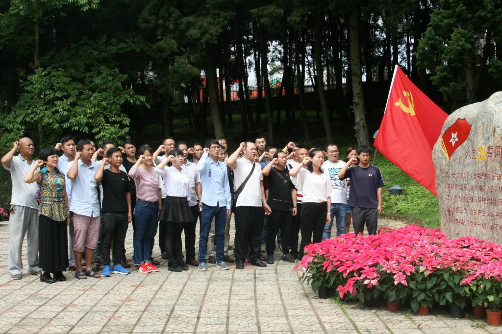 在寬大的會(huì)址廣場(chǎng),在一塊塊高大的石碑前,在鐫刻著革命先輩群英像巨大壁雕前,黨員們深入了解云南第一次黨代會(huì)的歷史意義,穿越近一個(gè)世紀(jì)的時(shí)空隧道,追溯那個(gè)血雨腥風(fēng)的年代,仿佛看到革命先輩們投身革命匆匆忙碌的身影。在觀(guān)看紀(jì)錄片《光榮的查尼皮》全面了解黨在云南“星星之火,可以燎原”的奮斗征程后,黨員們走進(jìn)歷史陳列館,瞻仰烈士的生前照片和遺物,參觀(guān)“云嶺星火、迤南風(fēng)云、紅土先驅(qū)、解放蒙自”等主題展覽,閱讀革命先烈們的事跡。黨員們走進(jìn)會(huì)址的草屋,切身感受當(dāng)年會(huì)議的情景,仿佛還能看到在明亮的油燈下,革命先輩們不惜拋頭顱、灑熱血的慷慨激昂。 在刻有早期黨旗和新時(shí)期入黨誓詞的石碑前,29名新黨員面對(duì)鮮紅的黨旗宣誓,整齊而響亮的誓言久久在查尼皮的山林中回響。站在新的起點(diǎn),黨員們表示將發(fā)揮的先鋒模范作用,忠實(shí)履行職責(zé),愛(ài)崗敬業(yè),積極投身企業(yè)改革發(fā)展的大潮。